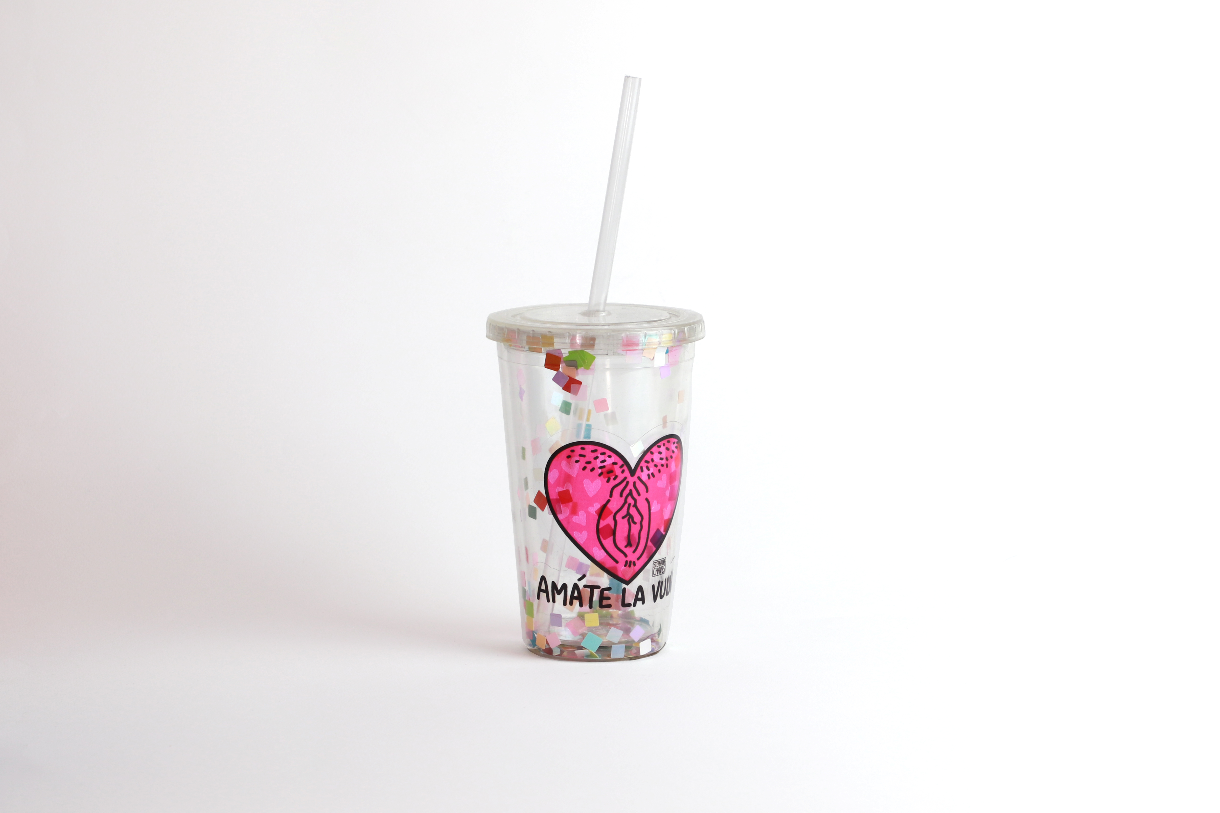 Vaso de plástico doble pared, con tapa y popote, gliter de colores, capacidad 500 ml