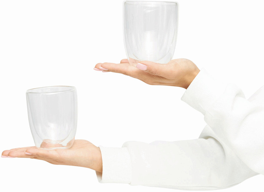 Ø 8,3 x 10 cm. Capacidad 280 ml cada vaso. Vidrio. Set de vasos doble pared. Apto para bebidas frías y calientes. Presentación en caja de regalo.